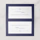Eleganten, snyggt bröllop, har platskort med chic marin blå text på vit bakgrund, intill klassisk marin.