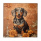 Eleganten Dachshund och Marigolds Ceramic Tile tillför stollig och charm till alla utrymmen. Den här keramiska plattan av hög kvalitet är ett vackert tillägg till din hemmabruk. Vare sig den används som väggkonst, som en dekorativ trivet eller ingår i DIY-projekt är den här plattan säker på att ge glädje till vilket rum som helst. Perfekt för hundälskare eller andra som uppskattar levande, naturinspirerade mönster.