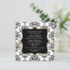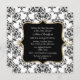 Stilfull bröllopsfestinbjudan i fyrkantigt format, med ett svart och vitt damastmönster som bakgrund. Vackra grafik med en guldtonad ram runt ett svart textfält, i mitten, med anpassad vit text. Anpassa texten för din bröllopshändelse. Vacker inbjudan som bruden kommer att minnas.