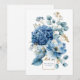 Bjud in dina gäster med en hisnande elegans med denna sofistikerade blommiga bröllopsinbjudan. Designen visar en fantastisk, målerisk akvarellbukett arrangerad vertikalt mot en ren vit bakgrund. En magnifik dammig blå hortensia ger en frodig fokuspunkt, vackert kompletterad av stora, mjuka peon- eller rosliknande blommor i stålblå och krämvit nyans med blåa accenter. Denna utsökta arrangemang är konstfullt sammanflätad med dammiga blågröna eukalyptusblad och ömtåliga sprutar av gnistrande guldglitter botanik, vilket ger en touch av modern lyx och magisk glans. En liten, minimalistisk guldram vilar nära basen och ger en subtil, sofistikerad detalj. Perfekt för sofistikerade bröllop (särskilt med ett "något blått" tema), är denna design också idealisk för eleganta brudtillställningar, födelsedagsfiranden, årsdagsfester eller exklusiva trädgårdseven