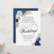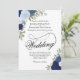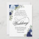 Denna eleganta bröllopsinbjudan har fin kalligrafiskrift omgiven av en mängd handmålade akvarellrosor i nyanser av dammig blå, marinblå och indigo. Blommorna är sammanflätade med kvistar av lavendel, grönska och eukalyptusblad vilket ger den en rustik trädgårdskänsla. Vacker och stilren väg att inbjuda dina nära och kära att dela din speciella dag.