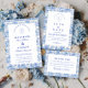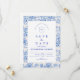 En elegant blå och vit chinoiseriedesign inspirerad av klassiska Delftska porslinsmönster. Den invecklade blomsterbården omger en ren central panel och skapar ett förfinat och tidlöst uttryck för sofistikerade bröllopsfiranden. Ömt europeiskt toaljearbetat konstverk kombinerat med skarp marinblå typografi ger designen en arvsestetik som påminner om fint porslin och vintage pappersvaror. Perfekt för par som planerar ett klassiskt blåvitt bröllopstema med traditionell elegans.