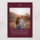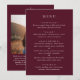Klassisk bröllopsmeny med en enkel men elegant design i en djup burgunderfärg som är perfekt för ett höstbröllop eller ett vinter/julbröllop. Använd mallen för att lägga till ett foto eller ta bort det i designverktyget.