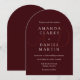 Förhöj din bröllpsdag med denna djup burgunderfärgade valvbröllopsinbjudan, designad för par som älskar tidlös elegans med en modern kant. Med en klassisk valv-silhuett i rik, djup burgunderfärg - årets säsongs juvelton - innehåller denna design personliga initialer som en sofistikerad vattenstämpel i bakgrunden, vilket ger en lyxig monogramtouch utan att överväldiga den rena layouten.