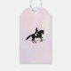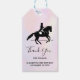 Tack för att du gav märkrn med en svart och vit illustration av ett dressyr. Hästen och riddaren utför en pirouette. Klassi och vacker. Ange vattenfärgsbakgrund i delikat och inaktiverat pastellfärg.