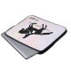 Laptop sleeve med en svart och vit illustration av ett dressyr. Hästen och riddaren utför en pirouette. Klassi och vacker. Ange vattenfärgsbakgrund i delikat och inaktiverat pastellfärg.