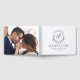 Elegant blommigt gäst bok med ett monogram som visas i ett svart kalligrafiskt skript omgivet av en vapensköld med dammiga blått och vit ros, lush eucalyptus löv och rik bröllop foliage. Anpassa den dammiga blåa blommigten bröllop gäst bok med uppgifter om namn och bröllop nedan. Lägg till anpassningsbar i ryggraden, t.ex. namn, bröllop-datum osv. Baksidan av blommigtens gäst bok har förlovningen vågrät.