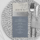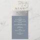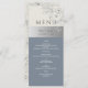 Lägg till lite elegans till ditt vinterbröllop med den här häpnadsväckande boho-chic bröllop-menyn. Med en vacker dammig blå bakgrund, guldblommor och silver-accenter blandar den perfekt modern och vintage inslag för ett sofistikerat och romantiskt utseende. Idealisk för en vinter firande ger den här menyn en unik, förfinad beröring till din speciella dag.