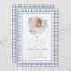 Elegant Dusty Blue Gingham Photo Girl Baptism Invitation. For best results upload a square image of the baby.