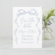 Eleganten sparar datumkorten med hand plockade-bandbåge med modernt handskrivet typsnitt i dammig blått, rent och enkelt. Underbar för det romantiska bröllop, den unika roligten vismisk bröllop, elegant avslappnad bröllop. Visa alla matchande delar i samlingen.