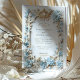 Meddela din speciella dag med den här lyxiga bröllopsinbjudan med mycket dammiga blå vattenområden och delikata vita blommor som är sammanflätade med guld baroque-inspirerade detaljer. Den ornerade faux-präglade ram tillför en aning sofistikering, medan den grå vita bakgrunden skapar ett tidslängd och elegant utseende. Perfekt för bröllop med vintage, romantik eller regaltema. Observera att accenter och reliefeffekter från guld trycks och inte innehåller äkta metallfolie eller upphöjt struktur.