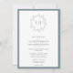 Den här eleganten och den högtidliga inbjudan till dammigt blåbröllop innehåller en löv-andedräkt och ditt eget monogram initialer på en vit bakgrund och klassisk typografi och manus, omgiven av en dammig blå gräns. Den här inbjudan är enkel att anpassa med din egen bröllop-information. Detta är en enkel och klassisk utformning av den romantiska bröllop-arenan i bröllop och kan användas för att hålla bröllop i vår, sommar, fall eller vinter.