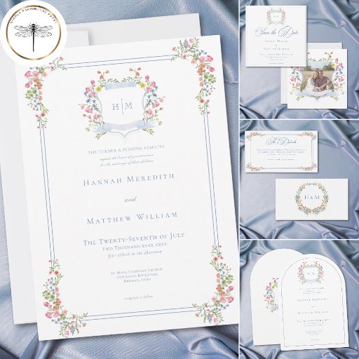 Elegant Dusty Blue Pastel Wildflower Crest Wedding Spara Datumet