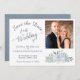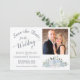 Det här vackra bröllop spara datum-kortet har en rustik boho-chic med ett kluster av handmålat ro, blommar och eukalyptus löv i skuggor av dammig blått och sage-grönt. På den lämnat sidan av kortet finns ett vackert skript med kalligrafi som lyder "spara datumet för bröllop i.." med utrymme för namn, plats och en kort-anteckning. På högerna finns det utrymme för fotot ovanför blommorna. Elegant, snyggt och chic, det här kortet är ett underbart sätt att låta dina vänner och familj veta att spara datumet för din speciella dag.