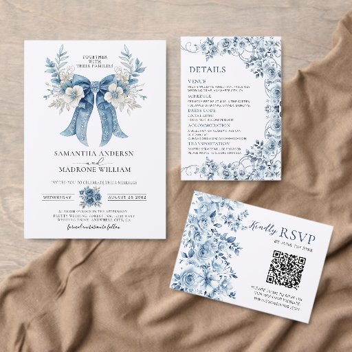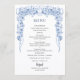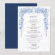 Delight your guests with this beautiful dusty blue floral wedding menu card! Framed by an intricate border of soft blue roses, delicate blooms, lush greenery, and subtle swirling accents, this elegant design lists your reception delights: starters like Caesar Salad with Croutons and Lobster Bisque Soup, mains featuring Filet Mignon with Mashed Potatoes & Roasted Asparagus or Chicken Marsala, vegetarian Penne with Roasted Carrots, dessert options including Wedding Cake, Cupcakes & Brownies, plus an open bar with coffee/tea. Personalized with "Enjoy! SAMANTHA & MARONE AUGUST 26 2022" at the bottom—perfect for table settings, matching your dusty blue suite, and creating a polished, romantic dining experience. Ideal for classic, garden, or boho-inspired weddings!