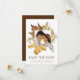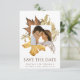 Elegant Dusty Brown Rustic Autumn Foliage Fall Wedding sparar datumkortet. Söt, elegant och moderna bröllopsinbjudningar till ditt speciella tillfälle! Perfekt för den vackra hösthögsäsong som lugnar hösten! Vattenskärg mörk ljusbrun och guldfärgad gult höstblad löv gräns med en mängd maple löv, ek löv och torkade blommor ramar överst på er firande i bröllop. Din namn finns i modernt teckensnitt högst upp och på omvänt kort visas en mörk brun mönster-bakgrund längst bak. Anpassa information om bröllop, datum, plats och annat på framsidan.