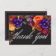 Omfamna den överdådiga skönheten i en höstlig blomsterfest med vårt fängslande tackkort för bröllopsfest. En dramatisk, men mjuk svart bakgrund ger den perfekta duken för en hisnande realistisk bukett. Föreställ dig en livfull explosion av färg, med rosor i orange och mörk magenta, små rosa blommor och violetta violer och bredvid persikoröda krysantemum och andra livfulla blommor. Frodig, mörkgrön lövverk fullbordar arrangemanget och tillför en touch av naturlig elegans. Denna fängslande design är perfekt för alla årstider och speglar den passionerade intensiteten i er kärlekshistoria. Ert tackmeddelande visas i elegant skrivstil, vilket säkerställer att det sticker ut vackert mot den dramatiska bakgr