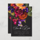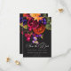 Omfamna den överdådiga skönheten i en höstlig blomsterfest med vårt fängslande "save the date"-kort för bröllpet. En dramatisk, men mjuk svart bakgrund ger den perfekta duken för en hisnande realistisk bukett. Föreställ dig en livfull explosion av färg, med rosor i orange och mörk magenta, små magenta-rosa blommor och lila violer och bredvid persikoröda krysantemum och andra livfulla blommor. Frodig, mörkgrön lövverk fullbordar arrangemanget och tillför en touch av naturlig elegans. Denna fängslande design är perfekt för alla årstider och speglar den passionerade intensiteten i er kärlekshistoria. Ett elegant, vintage-aktigt typsnitt presenterar er kort, medan era bröllopsdetaljer visas i ett modernt teckensnitt, som