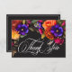 Omfamna den överdådiga skönheten i en höstlig blomsterfest med vårt fängslande tackkort för bröllopsfest. En dramatisk, men mjuk svart bakgrund ger den perfekta duken för en hisnande realistisk bukett. Föreställ dig en livfull explosion av färg, med rosor i orange och mörk magenta, små magenta rosa blommor och lila violer och bredvid persika krysantemum och andra livfulla blommor. Frodig, mörkgrön lövverk fullbordar arrangemanget och tillför en touch av naturlig elegans. Denna fängslande design är perfekt för alla årstider och speglar den passionerade intensiteten i din kärlekshistoria. Ett elegant, vintage-typografi tillkännager ditt kort, medan ditt tackmeddelande visas i elegant typografi och framstår vackert mot den dramatiska bakgrunden. Denna fört