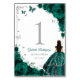 Emerald green silver and white Quinceanera celebration table number cards. Features brunette girl in ball gown dress, script font, silver butterflies, dark green roses and tiara. Perfect for an elegant princess style glam celebration. Personalize with your own details.