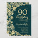 Emerald Grönt Guld Blommigt 90:e Födelsedagsfest inbjudan. Elegantens utformning med ro, faux guld-folie och typsnitt för typsnitt. Trendig inbjudan-kortets perfekt för en snyggt kvinnlig dag firande. Kan anpassas till vilken ålder som helst. Skrivna Zazzle-inbjudningar eller digital utskrivbar mall för omedelbar nedladdning.