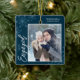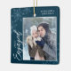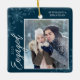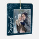 Denna mörk blått julprydnad är en perfekt gåva till det nya förlovaden paret. Utformningen har ett foto ram med handskriven text "Engaged" och accentueras med ljusblå snöflingor mot en mörk blått bakgrund. Anpassa med ett bilder av paret, deras namn och år.