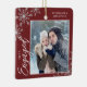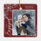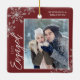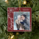 Den här röda julprydnaden är en perfekt gåva till det nya förlovaden paret. Utformningen har ett foto ram med handskriven text "Engaged" och accentueras med lätt grått snöflingor mot röd bakgrund. Anpassa med ett bilder av paret, deras namn och år.