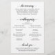 Minimalistiskt bröllopsprogram med en enkel design med texten "välkommen till vårt bröllop" tillsammans med era namn, datum och plats över ert favoritfoto. Baksidan har er ceremonielista, bröllopsfesten och ett tackmeddelande i svart på vit bakgrund. Accentueringstext är i ett elegant handskrivet skrivstil med svängiga linjer för en modern och chic twist. Dessa billiga bröllopsprogram är tryckta på pappersark för ett budgetvänligt alternativ.