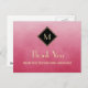Visa din uppskattning med den här rosa och svart möhippan för elegant och snyggt i monogrammet tack för vykortet. Denna enkla och sofistikerade övertoningsdesign med en modern diamantformad ram med guld gräns kan vara personlig genom att lägga till den monogrammerade begynnelsen av den brud som ska bildas samt ett personlig-meddelande. Platt tryckt bild, INTE metallisk.