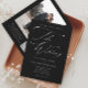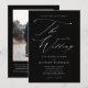 En elegant enkel svart och vit bröllopsinbjudan med modernt skrivstil och klassisk text. Baksidan har ett foto och QR-kod RSVP. Klicka på redigeringsknappen för att anpassa denna design.