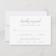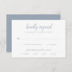 Klassiskt bröllop OSA-kort med en enkel design som visar sidhuvudet i ett traditionellt skript tillsammans med dina detaljer i dammigt blått över en vit bakgrund. Mallen innehåller måltider för dina gäster. Denna sofistikerade och elegant bröllop OSA kort är underbar för ett formellt bröllop i vår eller sommar.