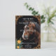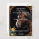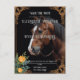 Den här bröllopsinbjudan har en slående häst som på ett snyggt sätt står mot en varm beige bakgrund. Ornera blommigt och rulla mönster ram bilden, och lägg till en aning sofistikering och charm. De invecklade uppgifterna om gräns i svarta och guld-toner framkallar en tidlös elegans, skapar det en perfekt av kärlek, styrka och skönhet för ett minnesvärt firande i bröllop. Anpassningsalternativ: Anpassa med namn, bröllop-datum och platsuppgifter för att skapa en unik nyckelfråga för din speciella dag.