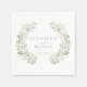 Visa elegans med våra varaktiga botaniska pappra bröllop-servetter, adorerade med en inkapslande vattenfärgsvit blomning som är sammanflätad med gröna löv och eukalytus löv. Personlig med namnen av bruden och brudgummen, lägger dessa klassiska blommigtar på blöjor till en utpräglad charm för den romantiska inställningen vår/sommar bröllop bord.