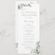 Den här unika botaniska designen har en böjande gren av elegant vattenfärgseukalyptus löv med konstnärliga silver-skisserade löv och vita vilda blommor.