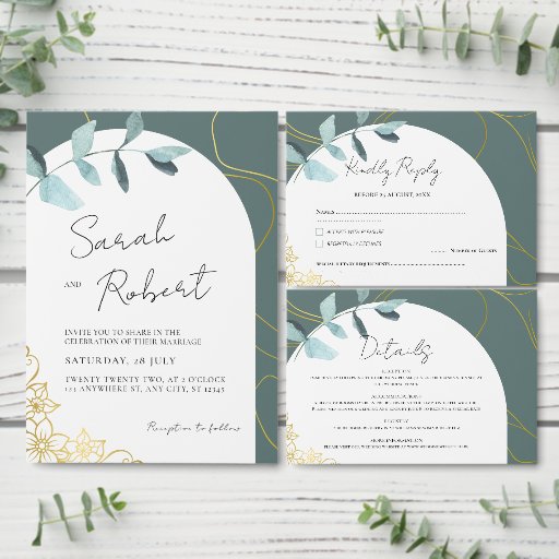 Elegant Eucalyptus & Guld-detaljer | Arch Theme Inbjudningar