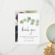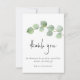 Elegant Eucalyptus Löv Script Photo Tack. En elegant guld gren av grönt eucalyptus löv flödar delvis över från högerna, med ett fast typografiskt Tack i ett modernt handskrivet stil. På baksidan byter du ut ditt favoritfoto från din dag (med liggande orientering). Resten av texten på framsidan kan du enkelt anpassa till ditt eget ord.