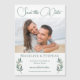 Ett kalligrafiskt skript för elegant grönt med två vattenfärgseukalyptus löv på båda sidor vid grund för att dekorera detta vackra förlovning fotokort för Spara datum magneter för ett fallbröllop. En underbar modern kvällsssvit i bröllop för en trädgård tillfälle på natten med ditt par fotografi under den kursiva typografin.