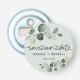 Dammig ljusgrön vattenfärg eucalyptus blad flasköppnare med spara vår dag i skrivstil med sammanlänkad hjärta, namn och datum.