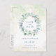 Elegant spara-datum-kort med en krans bestående av eukalyptusblad och grönska med en antydan till blått. Nedan finns dina bröllopsdetaljer i mörkgrönt över en pastellfärgad akvarelltvätt med fläckar av falskt guldglitter. Baksidan har ditt personliga meddelande och returadress för enkel frakt. Denna enkla, rustika design är bra för ett botaniskt tema-bröllop på sommaren.