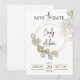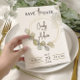 Meddela din speciella dag med detta eleganta eucalyptusgröna spara-datum-kort. Med mjuka akvarell-eucalyptusblad och moderna kalligrafifonts förkroppsligar denna design enkelhet och naturlig skönhet. Perfekt för botaniska, rustika eller minimalistiska bröllop, sätter det tonen för din fest med tidlös sofistikation. Helt anpassningsbart med dina bröllopsdetaljer, säkerställer detta spara-datum-kort att dina gäster markerar sina kalendrar med stil.