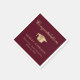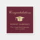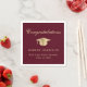 Eleganta burgunderröda examensservetter med en guldexamenshatt, "Grattis" i ett klassiskt kalligrafiskt teckensnitt och examenklassens namn, skola och år i modern typografi.