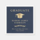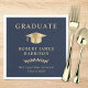 Eleganta mörkblå examensservetter med en guldexamensmössa, "Graduate" och examenklassens namn, skola och år i klassisk serif-typografi.