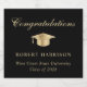 Eleganta svarta examensfestetiketter för gnistrande vin med en förgylld examensmössa, "Grattis" i ett klassiskt förgyllt skrivstil och examenklassens namn, skola och år i modern förgylld typografi.