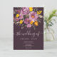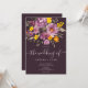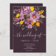 Eleganten faller under lila-blommigtens manusinbjudan med en modern kalligrafi och elegant bröllop i skript i lila, orange och gula blommor med sage grönt-löv på mörk lila.