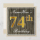 Denna enkla och eleganta födelsedagsinbjudan har ett personligt meddelande som "NameHärs 74-årsdag" (med "74" i en imitation av guldliknande färg) inom en rustik ruta med träutseende med en enkel ram. Namnet är skrivet med ett elegant, vitt, script-liknande typsnitt och kan anpassas. Baksidan har detaljer om den personliga inbjudan. En födelsedagsinbjudan som denna skulle kunna användas när man bjuder in folk till en födelsedagsfest för någon som firar sin sjuttiofjärde födelsedag. [~Z0000231]