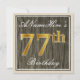 Denna enkla och eleganta födelsedagsinbjudan har ett personligt meddelande som "ANameHeres 77-årsdag" (med "77" i en imitation av guldliknande färg) inom en rusticerad träimitation med en fyrkantig yta med en enkel ram. Namnet är skrivet i ett elegant, vitt, script-liknande typsnitt och kan anpassas. Baksidan har detaljer om den personliga inbjudan. En födelsedagsinbjudan som denna kan användas när man bjuder in folk till en födelsedagsfest för någon som firar sin sjuttiosjunde födelsedag.