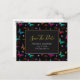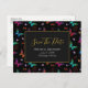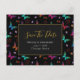 Ett bröllop spara datumet vykort designat med ett elegant mönster med en grafisk illustration av fladdrande fjärilar i många ljusa färger, kontrasterar mycket fint mot den svarta bakgrunden. Whimsical blommor, kvistar och blad lägger till en touch av charm. En svart ram med en guldbordad kant överst med din personliga text inuti.