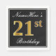 Den här enkla och elegant pappra napkin-designen innehåller ett meddelande som "Namehär's 21 Birthday" (med "21st" som har ett utseende som liknar guld) i en kvadrat med svart färgad med en enkel gräns-kontur. Namn är i en text som liknar en text med en vit färgad och kan vara personlig. Napkins som dessa kan kanske användas i en födelsedagsfest till någon som firar sin tjugoförsta födelsedag. [~Z0000136]