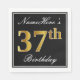 Den här enkla och elegant pappra napkin-designen innehåller ett meddelande som "Namehär's 37 Birthday" (med "37:e" som har ett utseende som liknar guld) i en kvadratisk färgad med en enkel gräns-kontur. Namn är i en text som liknar en skript med vit färgad och kan anpassas. Napkins som dessa kan kanske användas i en födelsedagsfest till någon som firar sin trettiosjunde födelsedag. [~Z0000136]