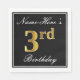 Den här enkla och elegant pappra napkin-designen innehåller ett meddelande som "Namn-här's 3rd Birthday" (med "3rd" som har en fingerad guld-liknande färg) i ett fyrkantigt område med svart färgad med en enkel gräns-kontur. Namn är i en text som liknar en text med en vit färgad och kan vara personlig. Napkins som dessa kan kanske användas i en födelsedagsfest till någon som firar sin tredje födelsedag. [~Z0000136]
